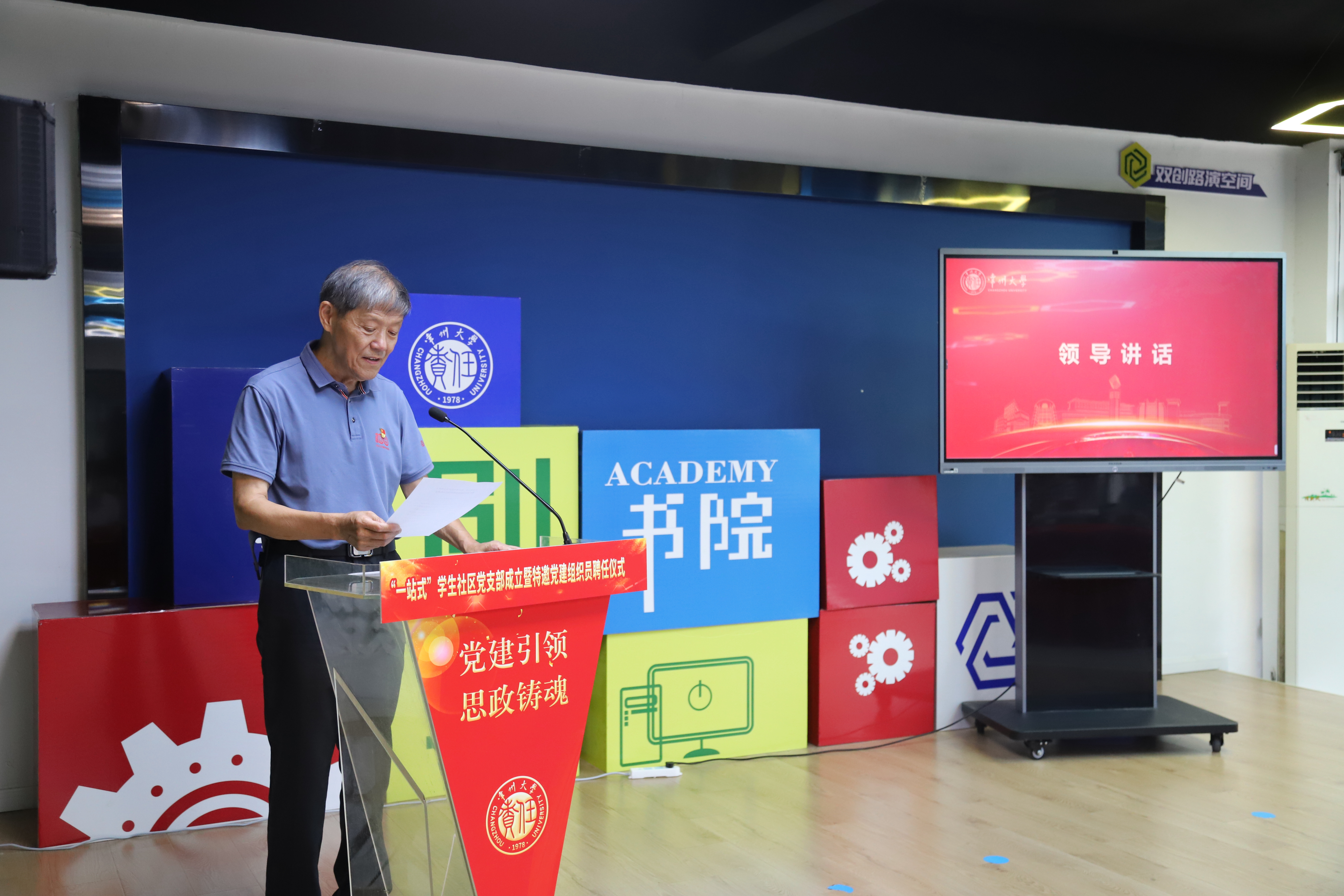 9 月 29 日下午,常州大学“一站式”学生社区党支部成立暨特邀党建组织员聘任仪式在科教城校区创享书院举行。校关工委常务副主任王凯全,党委常委、党委组织部部长、统战部部长秦义,离退休党委书记、离退休工作处处长陈曙钧,党委组织部副部长、统战部副部长陈启迪出席活动。特邀党建组织员及社区学生党员代表参加活动。党委研工部、学工部副部长华德仁主持仪式。