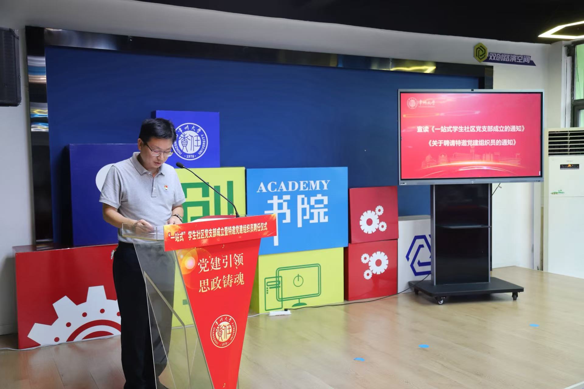 陈启迪宣读《关于成立创享书院学生社区党支部的通知》《关于聘请特邀党建组织员的通知》