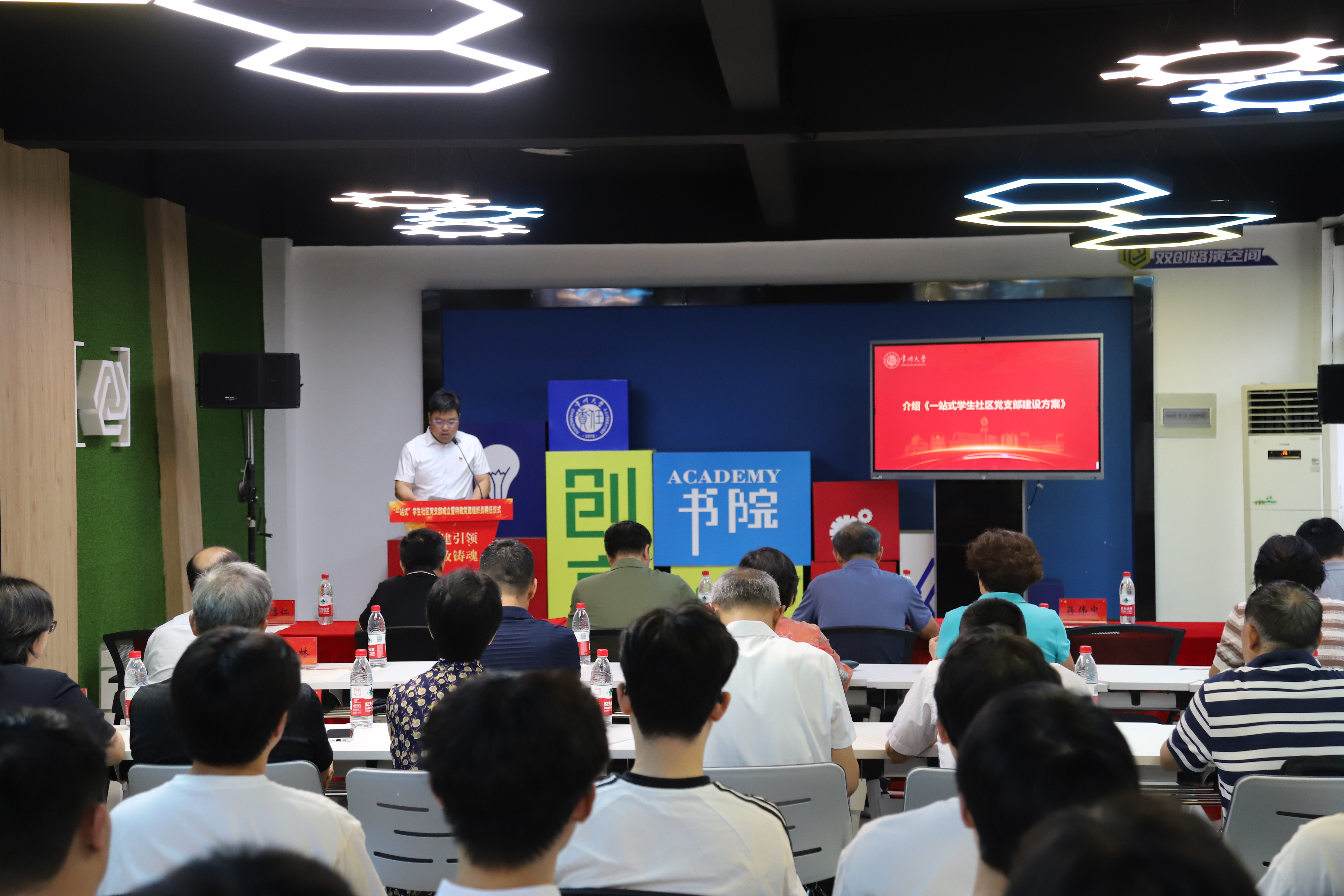 陈启迪宣读《关于成立创享书院学生社区党支部的通知》和《关于聘请特邀党建组织员的通知》。华德仁介绍《“一站式” 学生社区党支部建设方案》。仪式现场,全体党员重温入党誓词,强化身份意识与责任担当。