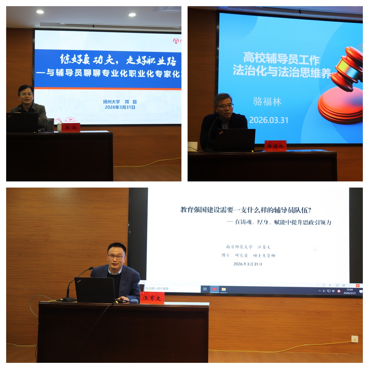 本次培训为期两天,课程围绕“角色认知、业务能力、职业发展”等模块展开,安排专题讲座、座谈研讨、经验交流等多种形式。专题授课环节,南京师范大学学生处副处长汪育文、扬州大学学生处副处长周超分别围绕辅导员核心素养与工作能力提升作专题培训,从理论高度与实践维度为学员提供系统指导;史良法学院骆福林教授作法律专题培训,结合学生工作典型案例,深入剖析法治思维在学生管理中的运用,帮助学员筑牢依法履职根基。座谈交流环节,学生处各条线负责人围绕生涯教育、思政、心理、管理、资助、本科招生等专题与学员进行深入交流。经验分享环节,材料学院程晓军、微电子学院韩福东、大数据学院沈达满、法学院陈慧香以“学院学生工作特色打造”为主题,分享了在学生教育管理服务中的特色做法与创新探索;安全学院陈子威、商学院王彩芳、外国语学院蔡震宇、石工学院宋佳、海外教育学院王卫卿围绕“辅导员能力提升与职业发展”主题,结合个人成长经历,就职业规划、能力提升、工作方法等方面作经验分享,分享内容贴近实际、案例鲜活,为新任辅导员提供了有益借鉴。